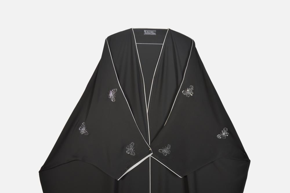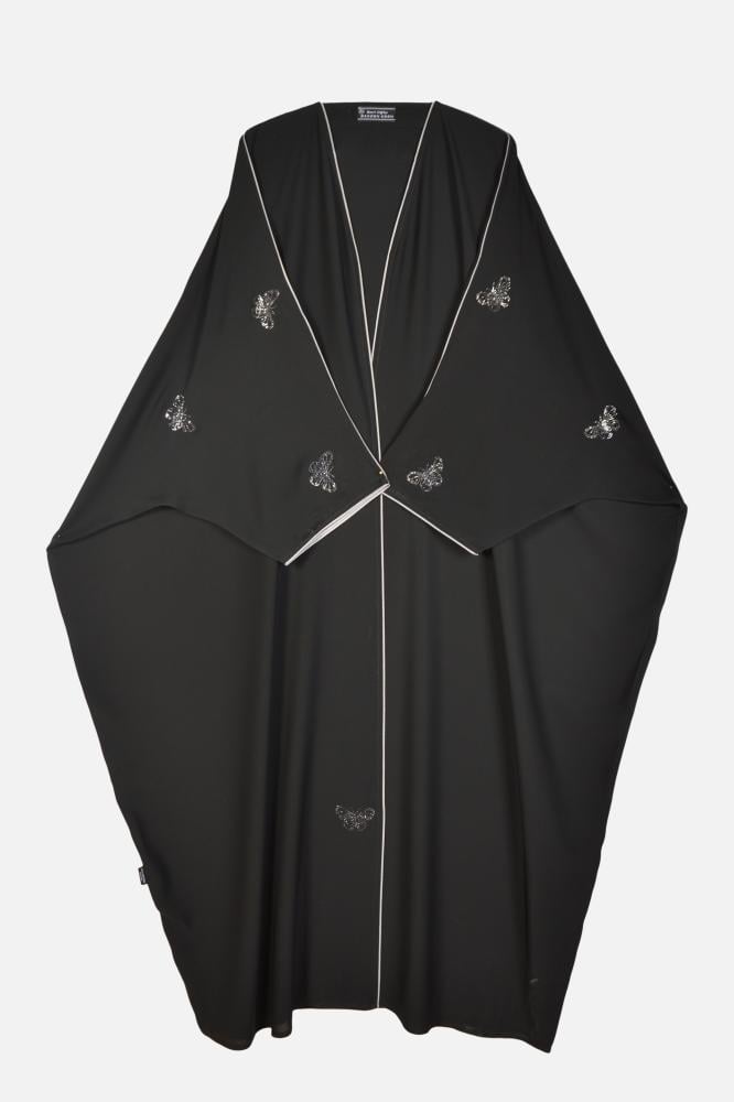 عباية فراشة مصممة من قماش الحرير الكوري ، باللون الأسود الداكن .